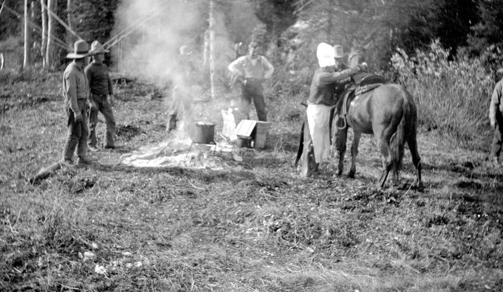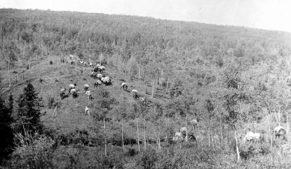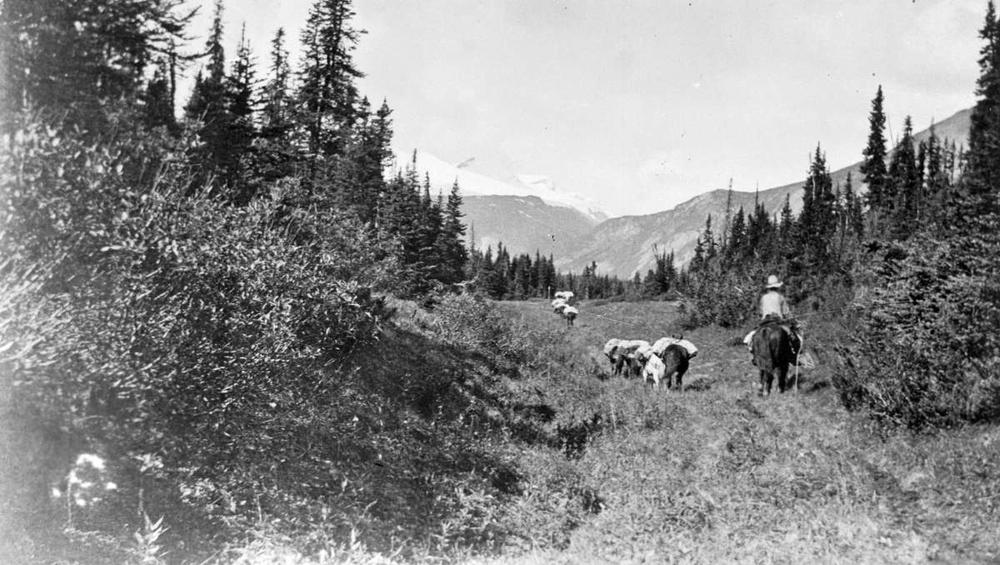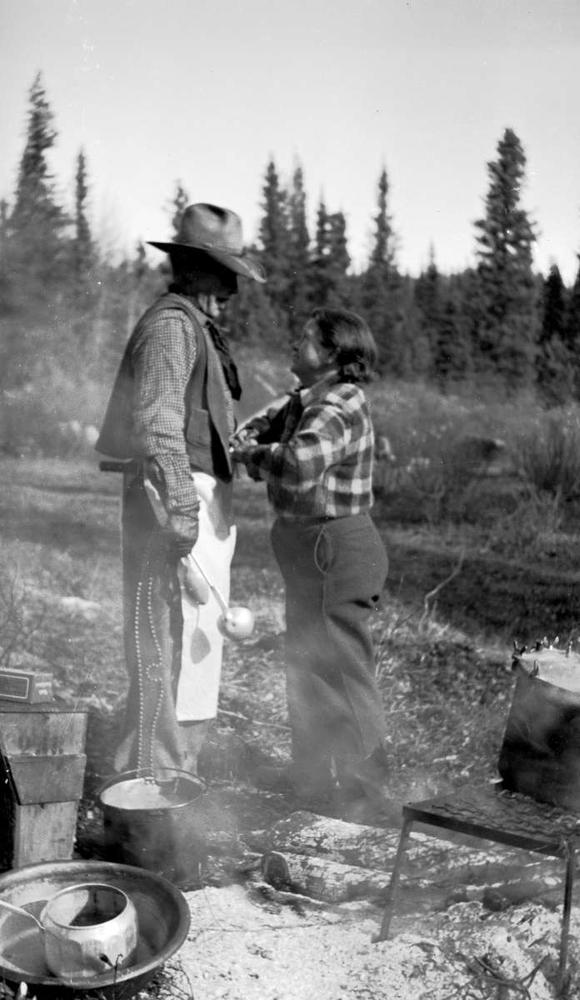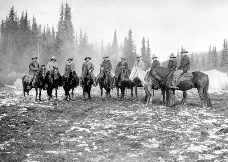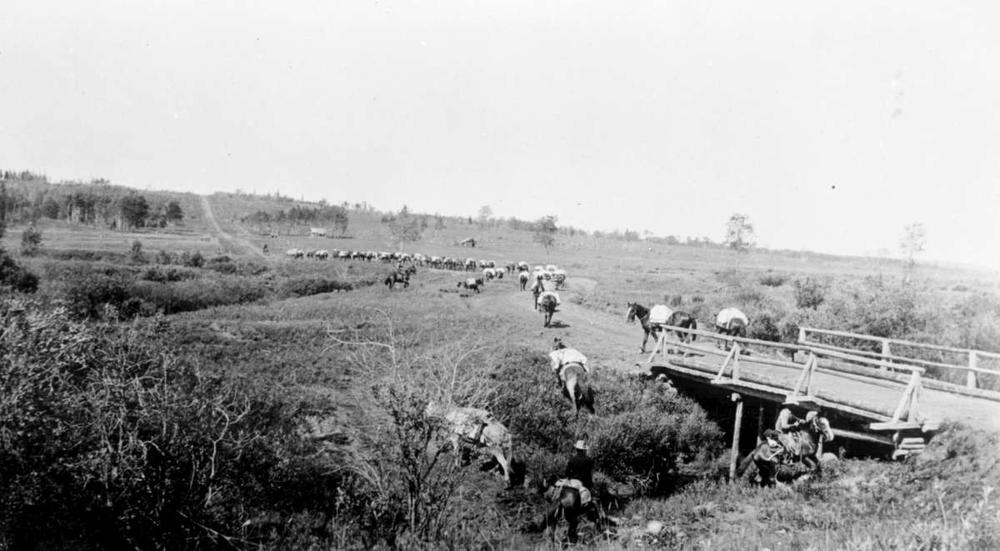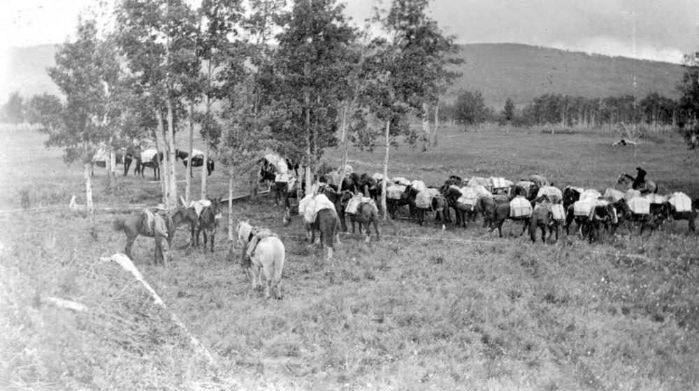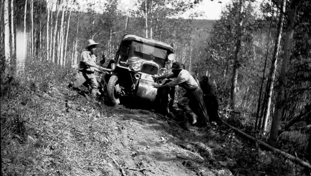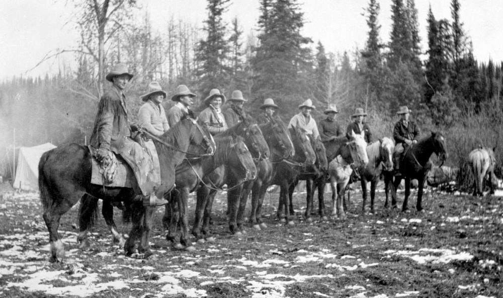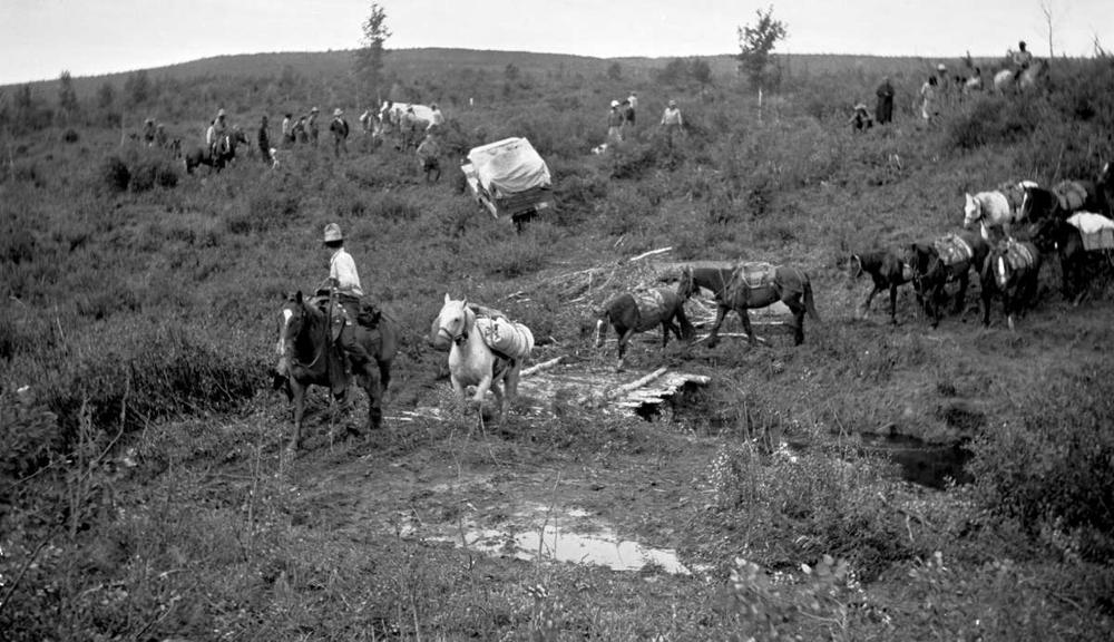 It started to rain shortly after they left Edmonton, and this dismal weather accompanied them through most of their journey. They made good progress, and despite the weather and bad roads were in Fort St. John in north-eastern British Columbia by the 17th of July. They stayed in Fort St. John until the 22nd of July, repairing the Citroëns, hiring dozens of cowboys to do the grunt work (a total of 53 cowboys accompanied the Expedition) and assembling a horse pack train of some 130 horses, and, of course, attending banquets. Vast quantities of champagne, foie gras, and caviar was assembled for the expedition. One pack horse was assigned to carry the mistresses shoes.